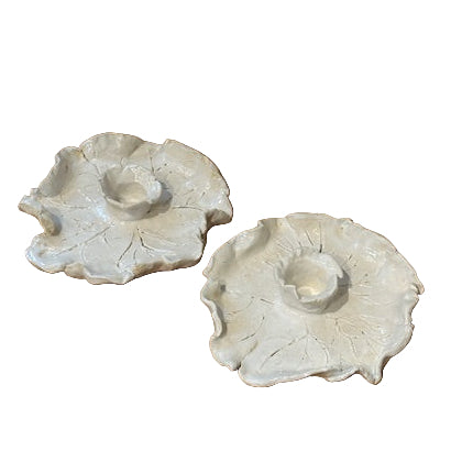 hand built pottery ruffled leaves candle holders in shiny white glaze